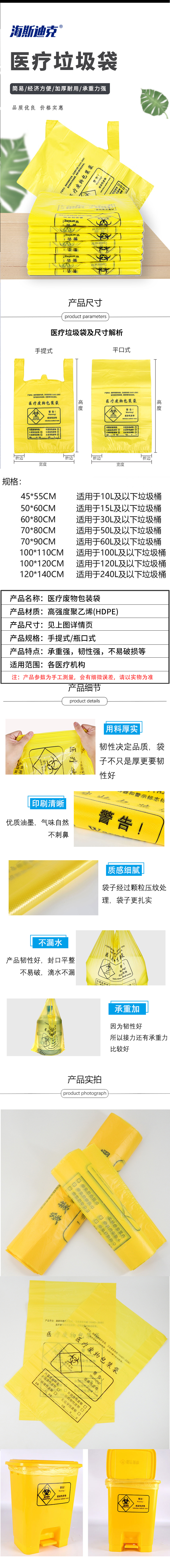 海斯迪克 加厚黄色医疗垃圾袋 HKY-86 平口60*70cm 100个 1包
