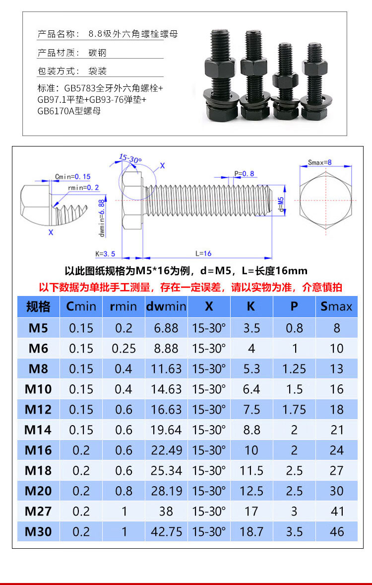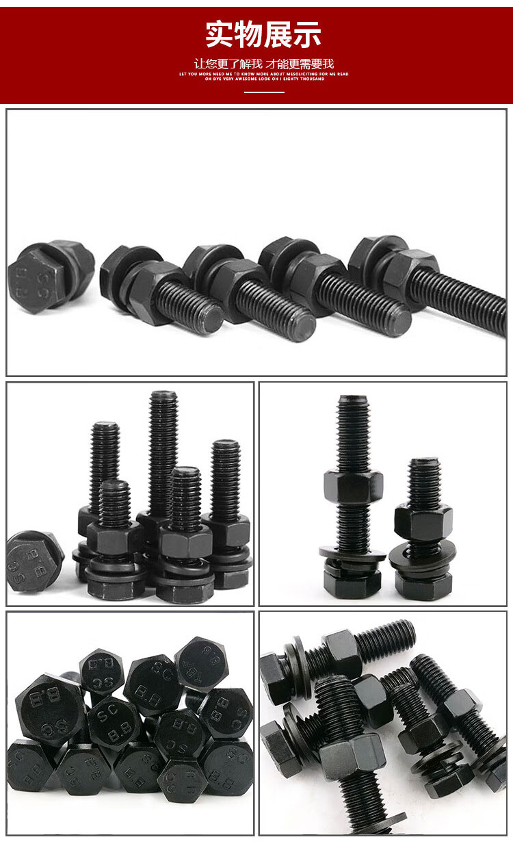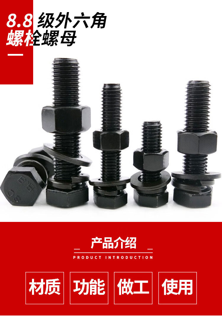 • 商品名称:海斯迪克 发黑8.8级外六角螺栓螺母平垫弹垫四件套