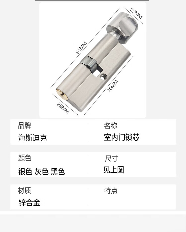 海斯迪克 房门锁芯 HKQL-25 锌合金+黄铜 灰色 91*29mm 1个