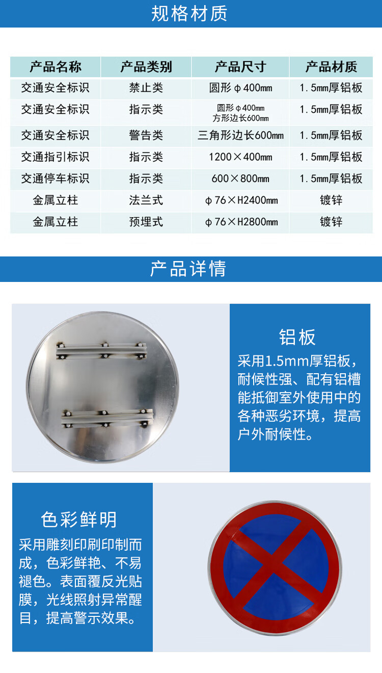 安全标识铝板覆反光膜 直径80cm 1.5mm普通工程膜 背后带铝槽+3m立柱预埋式