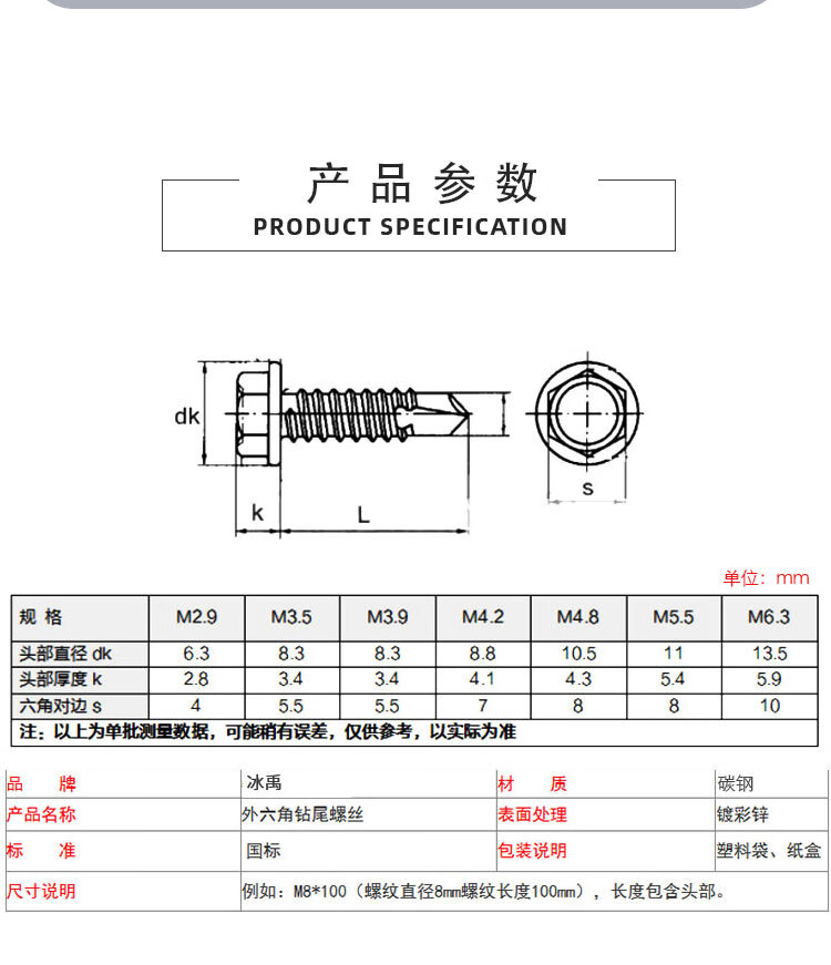 冰禹 外六角法兰钻尾螺丝 AA3442100 4.8×100 碳钢 镀彩锌 100个 1包