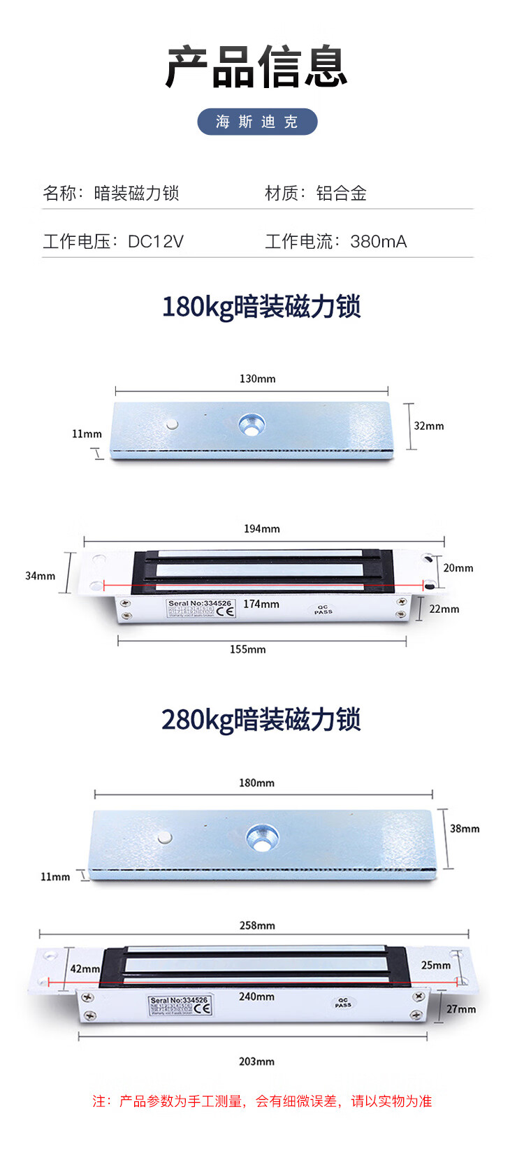 海斯迪克 暗装磁力锁 HKsq-549 单门280kg 1个