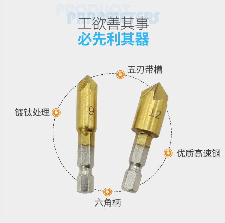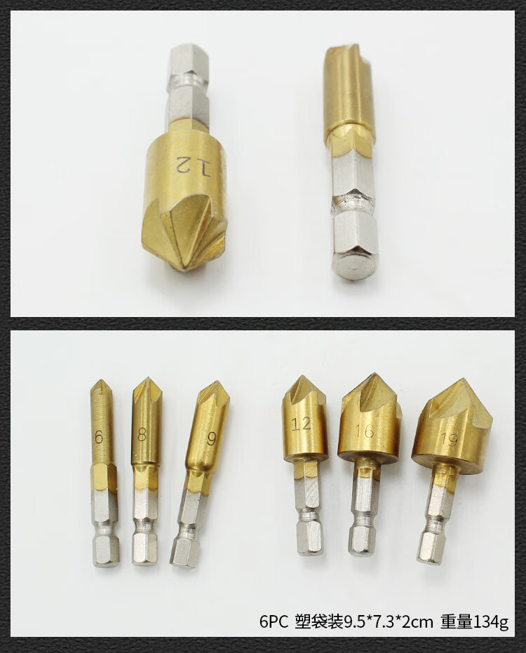 • 商品名称:海斯迪克 镀钛六角柄五刃倒角器沉头钻头