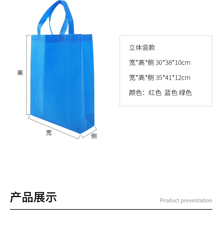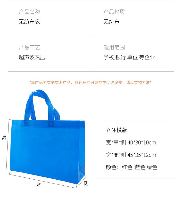 海斯迪克 无纺布购物手提袋 H-31 蓝色 立体横款 40*30*10cm 10个 1组