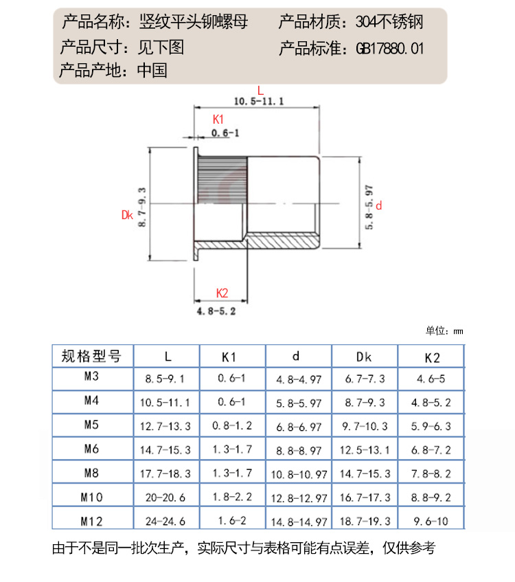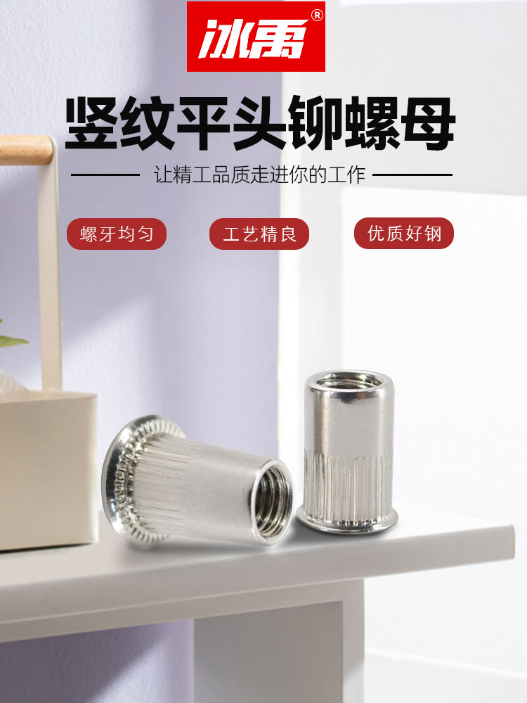 • 商品名称:冰禹 开口型竖纹平头铆螺母