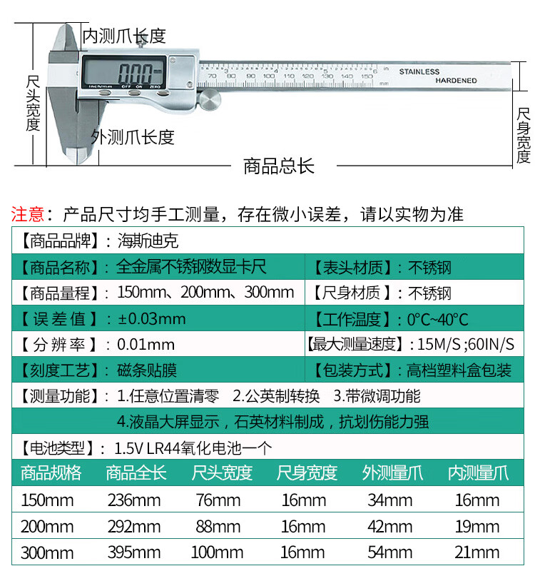 • 商品名称:海斯迪克 大屏数显游标卡尺