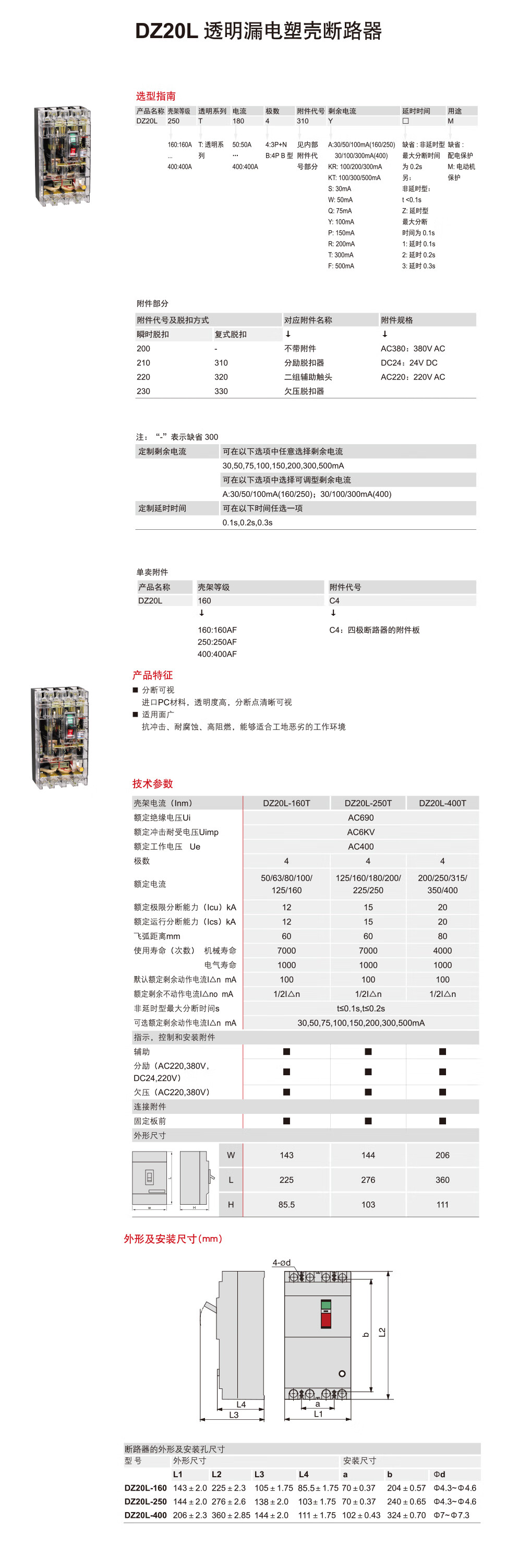 DZ20L-250T/4300 250A 150MA 透明 非延≤0.2 带铜鼻 DZ20L250T2504P02