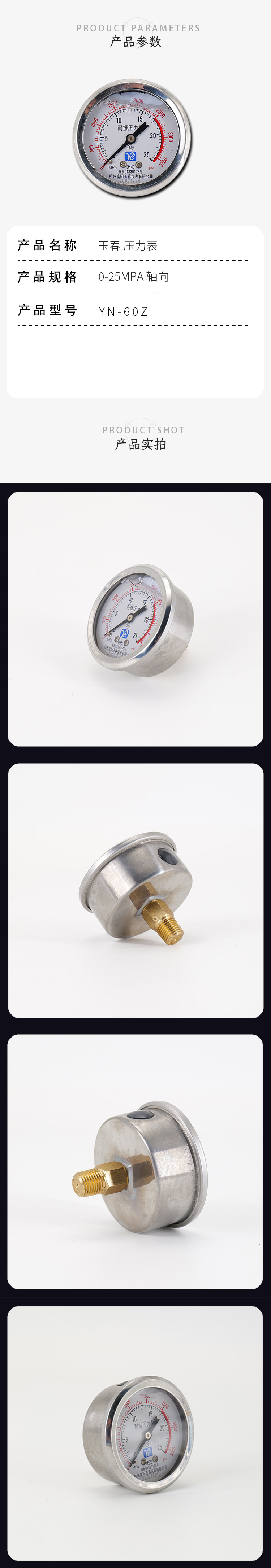 玉春 耐震压力表 YN-60Z 0-25mpa 轴向 M14*1.5 1只
