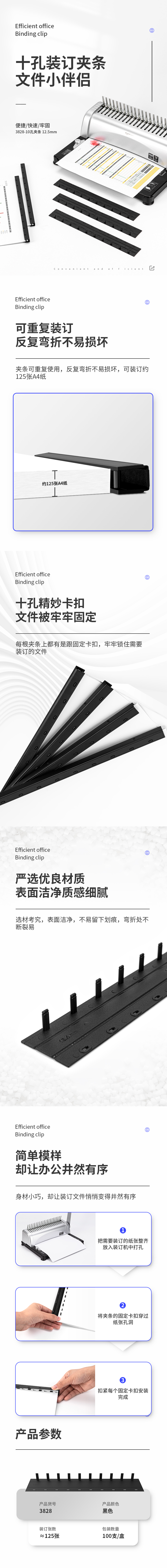 得力 10孔装订夹条 3828 黑色 300*12.5mm 100支 1盒