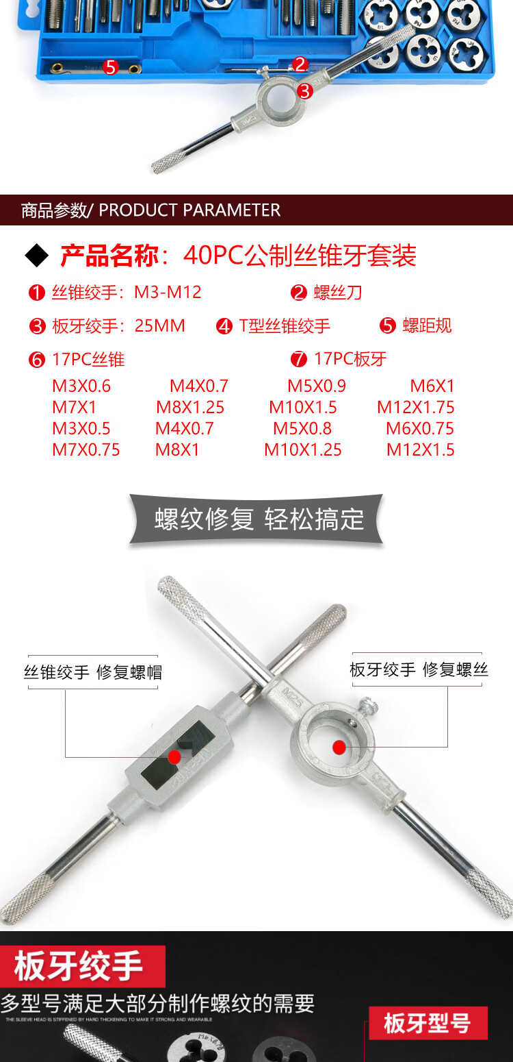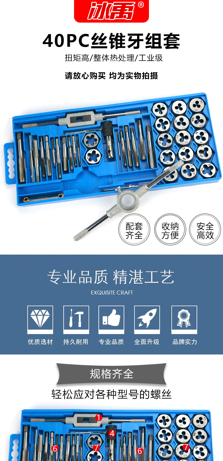 冰禹 攻牙绞手扳手用 BYJZ-1118 40PC丝锥板牙 40个 1套