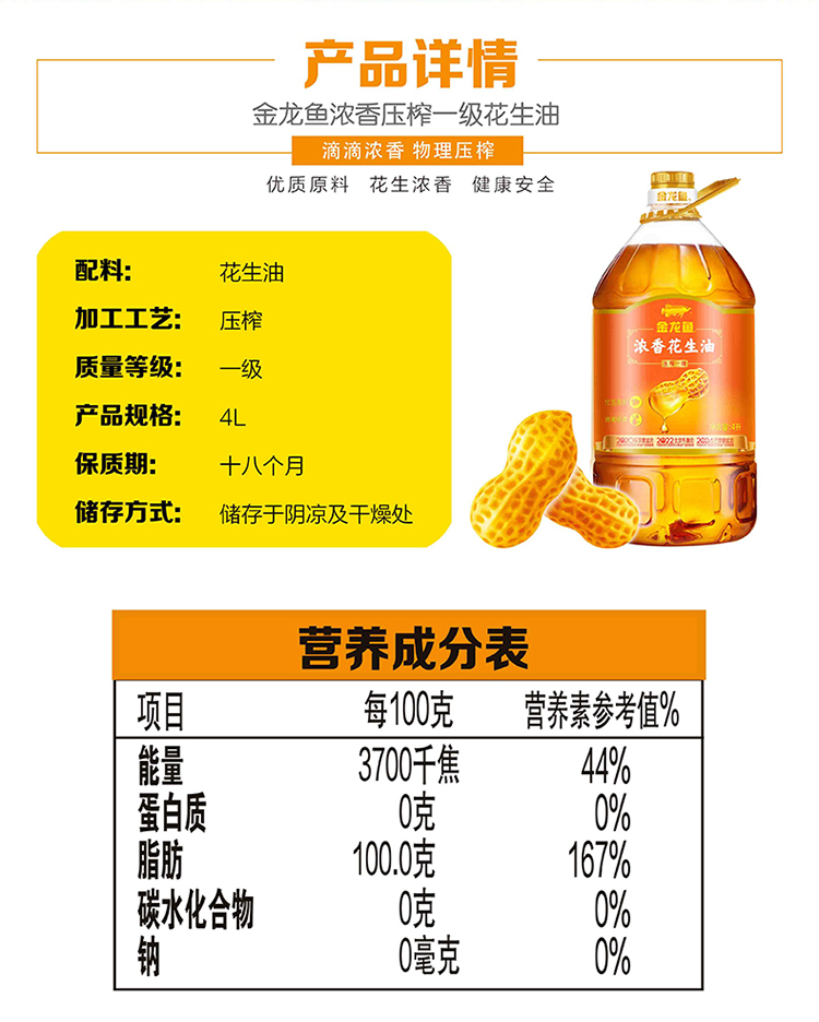 金龙鱼 物理压榨醇厚浓香花生油 4L 1桶