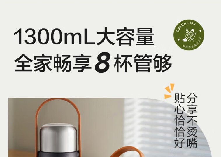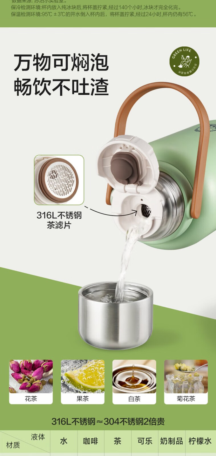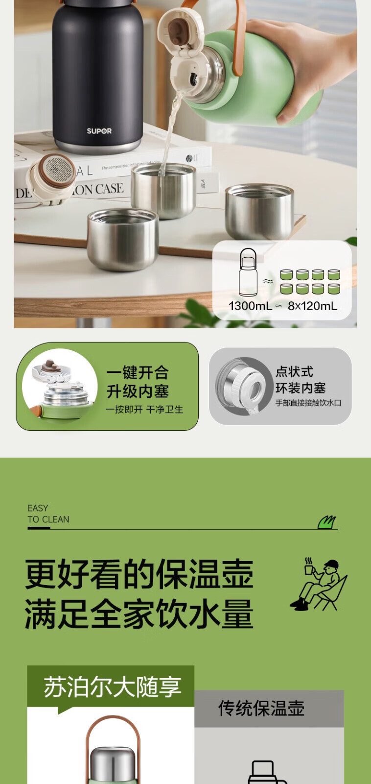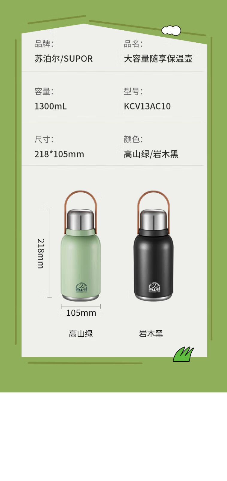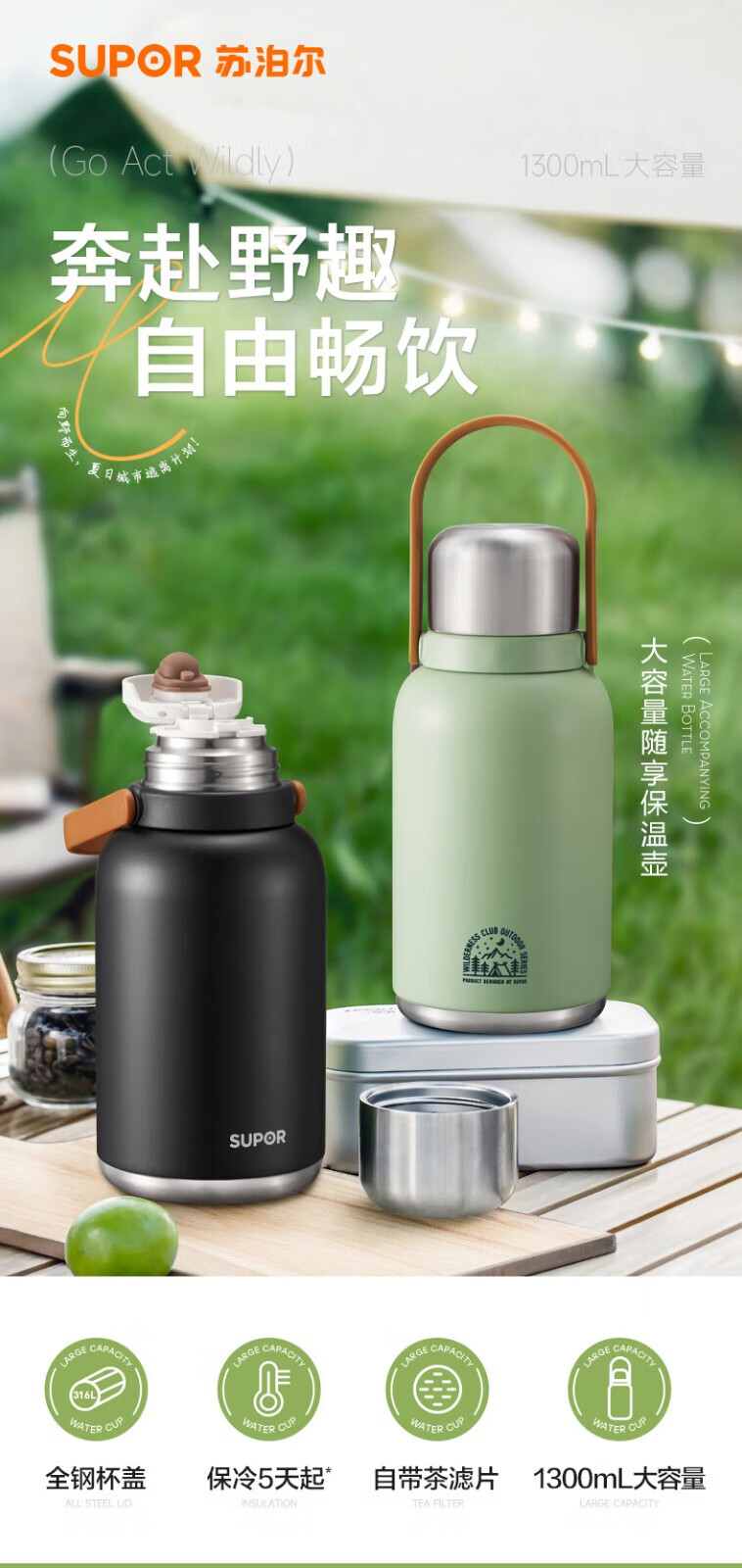 苏泊尔 316L不锈钢保温杯 KCV13AC10 岩木黑 1.3L 1个