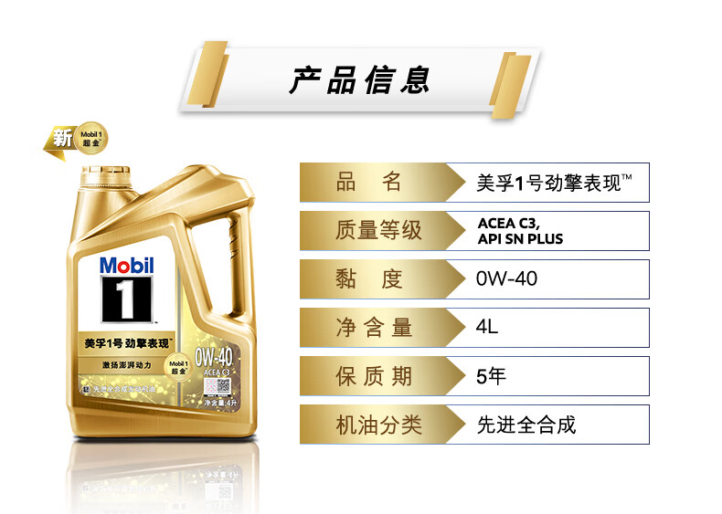 美孚 合成汽机油 0W-40ACEA 1号超金 C3级 4L 1瓶