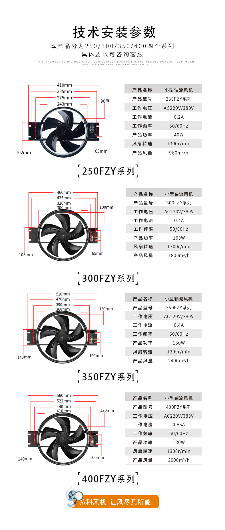 弘科 外转子工频轴流风机 250FZY3-D 40W 220V 1台