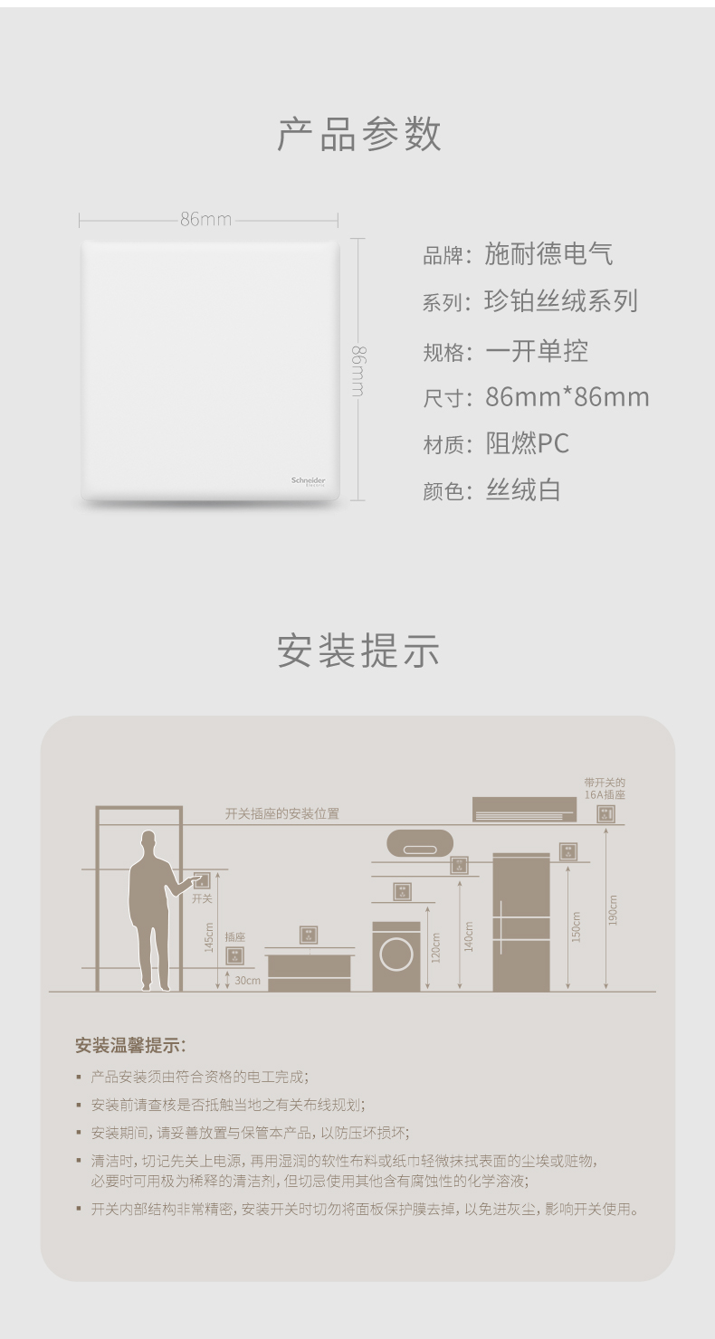 施耐德电气 86型开关插座面板 一开单控开关 丝绒白色 1个