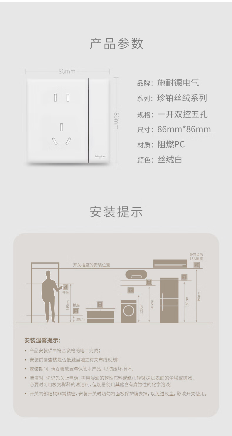 施耐德电气 86型开关插座面板 五孔插座带双控开关 丝绒白色 1个