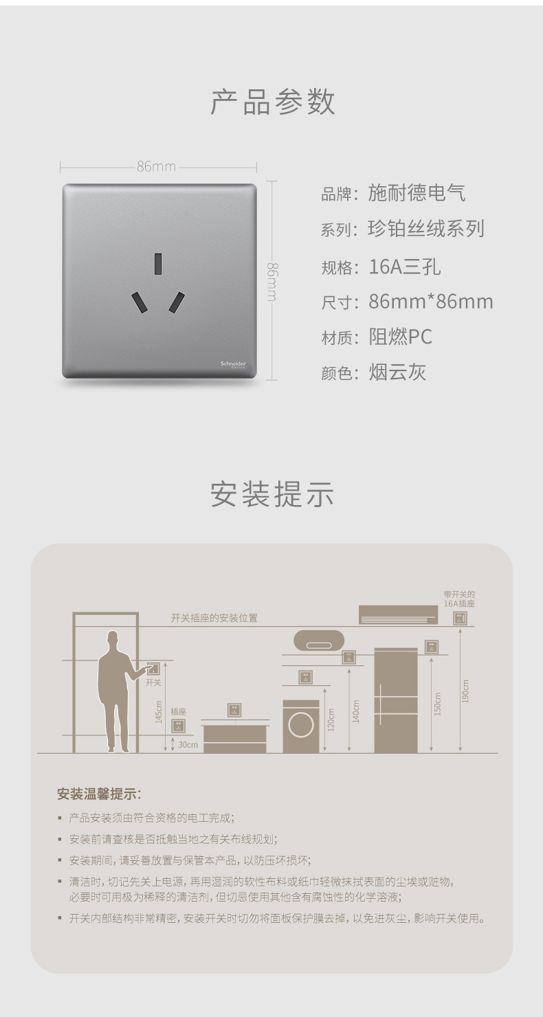 施耐德电气 86型开关插座面板 16A三孔大功率空调插 灰色 1个