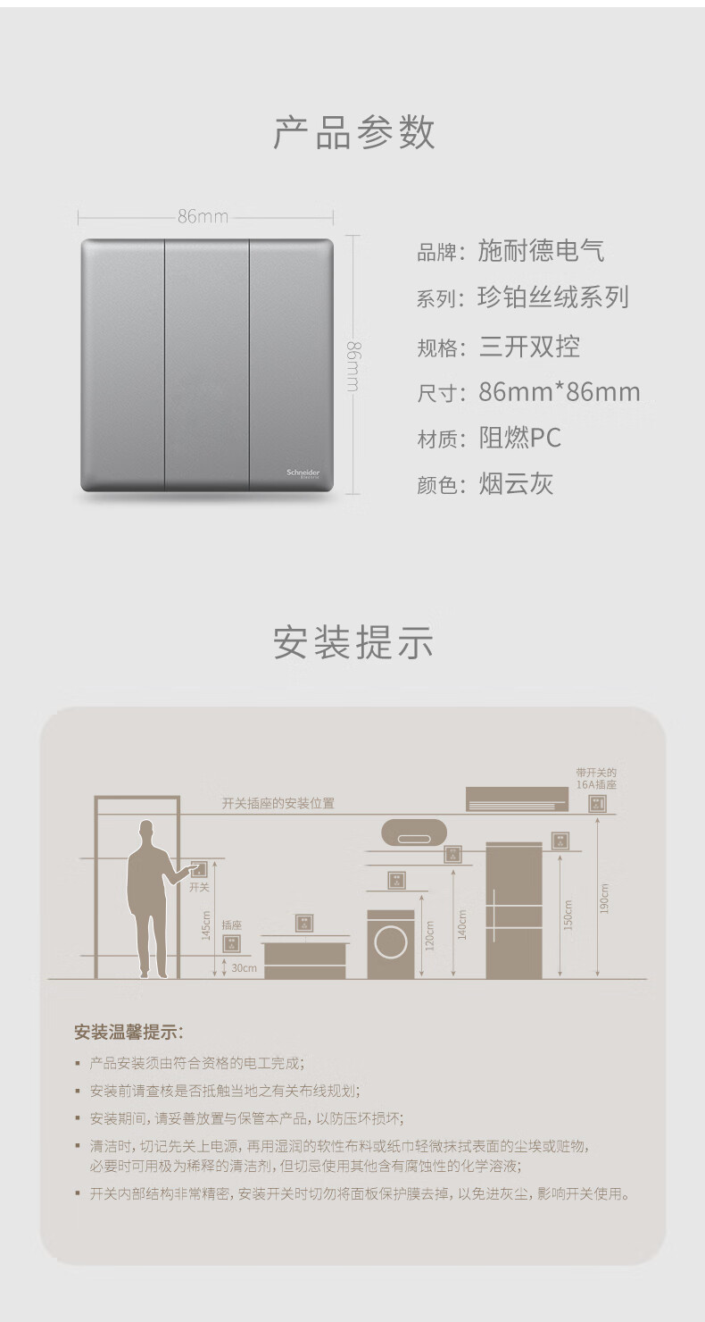 施耐德电气 86型开关插座面板 三开双控开关 灰色 1个