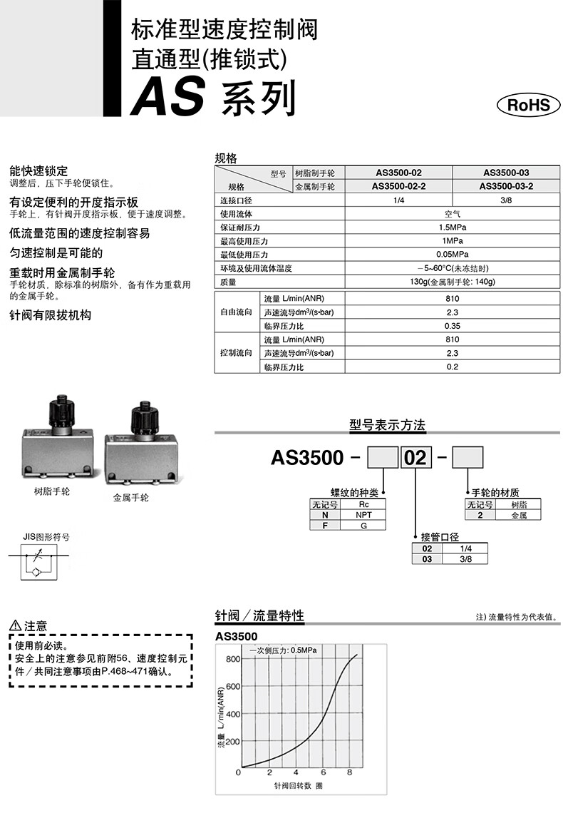 SMC AS系列标准型速度控制阀 AS3500-02 按下锁定直通型 1个