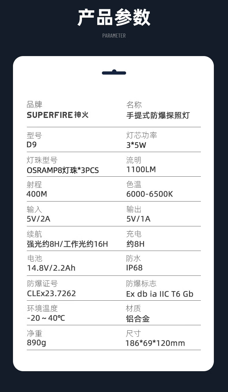 神火 手提式防爆探照灯 D9 5W 186*69*120mm 1个