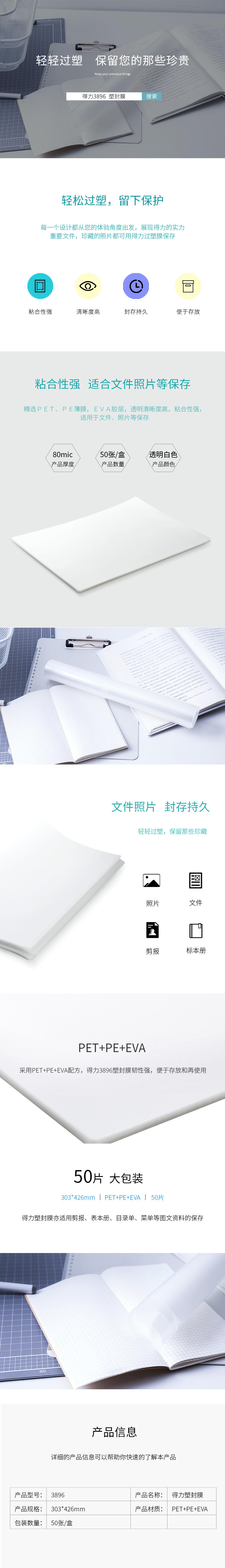 得力 护卡膜 3896 A3 303*426mm 80mic 50张 1包