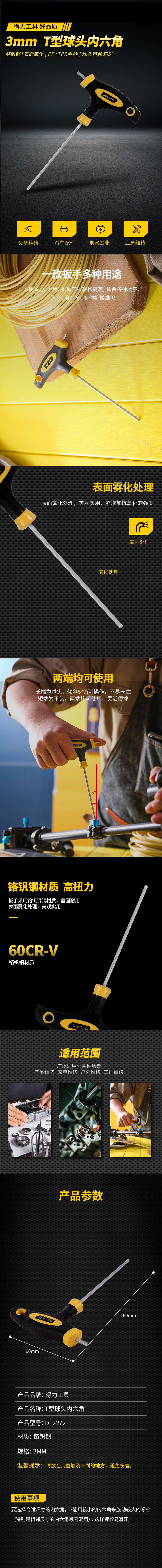 得力 球头T型内六角 DL2272 黄色 3mm 铬钒钢 1支
