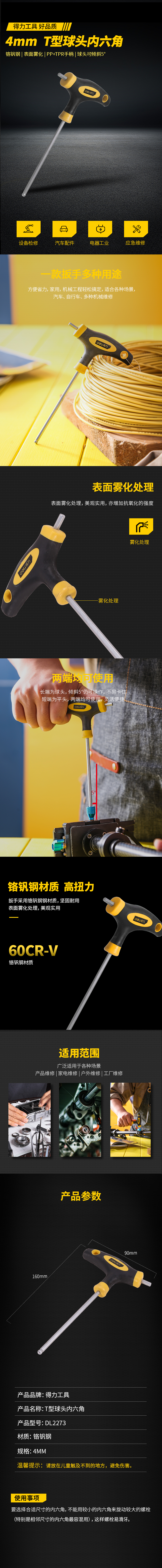 得力 球头T型内六角 DL2273 黄色 4mm 铬钒钢 1支