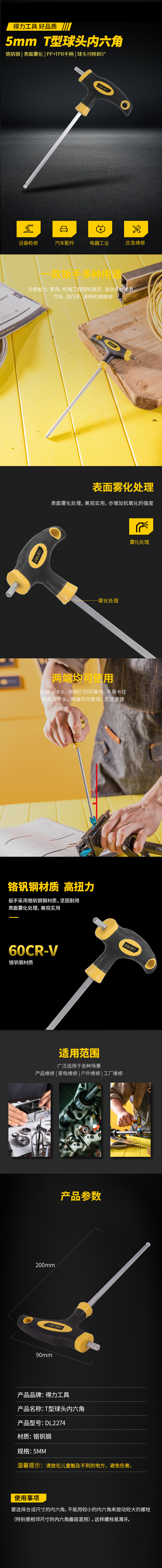 得力 球头T型内六角 DL2274 黄色 5mm 铬钒钢 1支