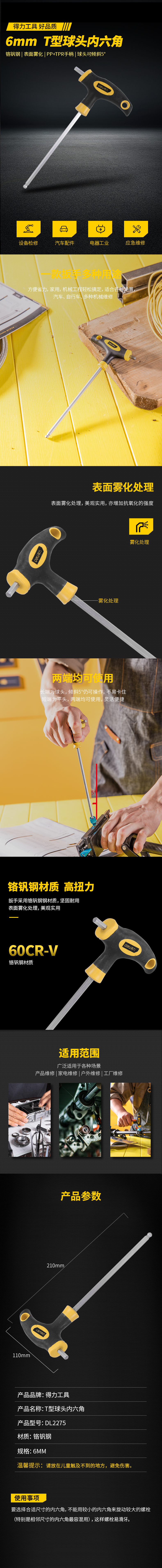 得力 球头T型内六角 DL2275 黄色 6mm 铬钒钢 1支
