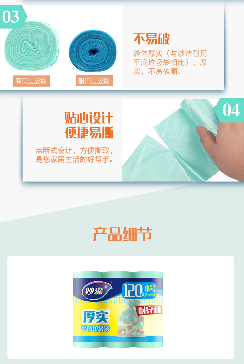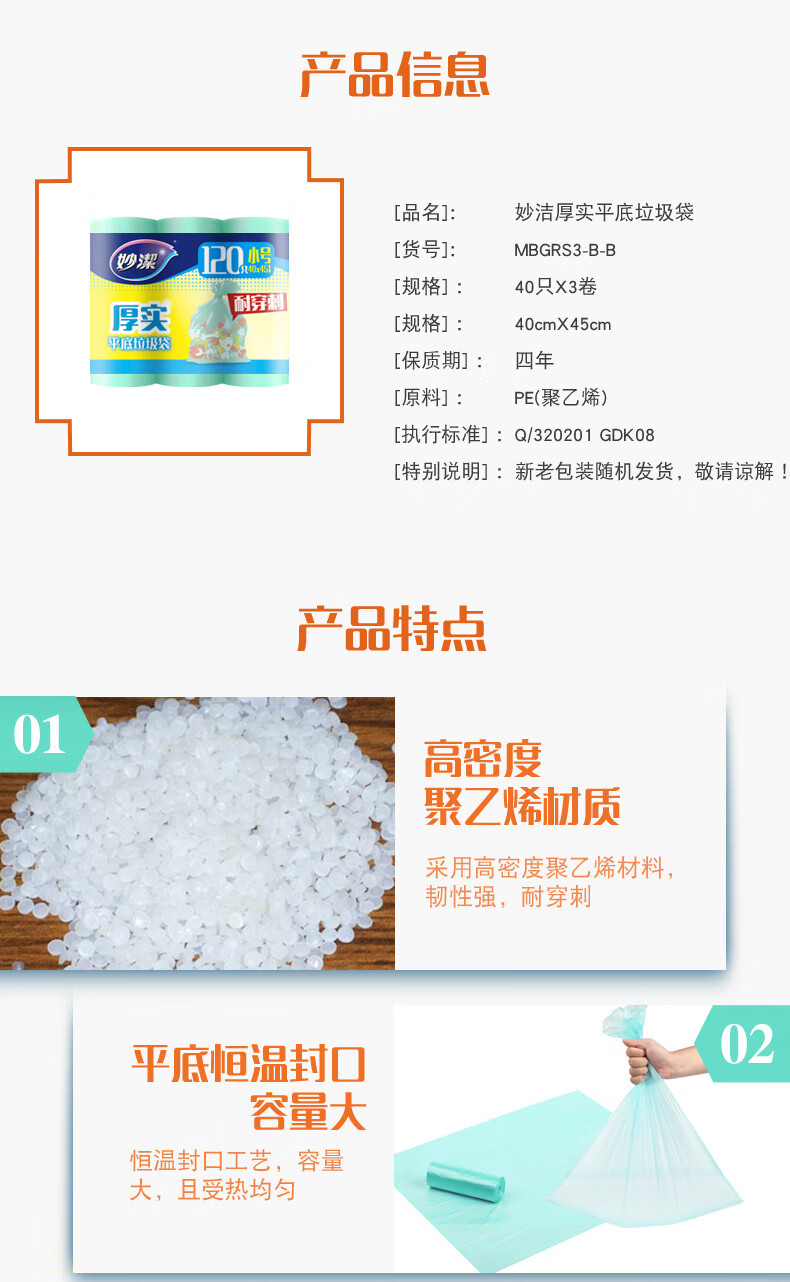 妙洁 厚实平底垃圾袋 MBGRS3-B-B 小号 400×450mm 蓝色/紫色随机发 40只×3卷×20包 1件