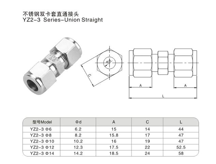 神驰 YZ2-3系列不锈钢双卡套直通接头 YZ2-3 φ10 1个