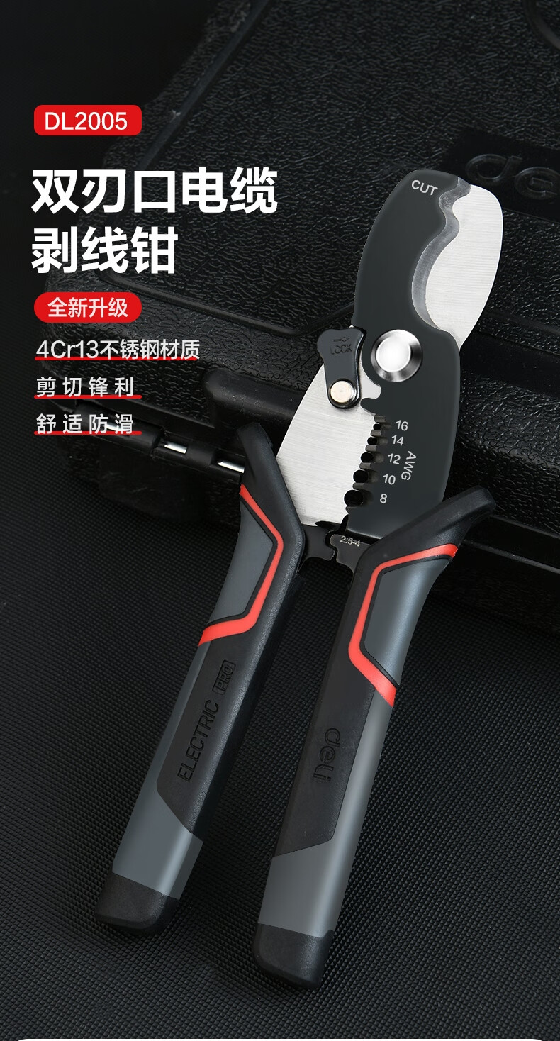 得力 电缆剥线钳 DL2005 黑色 剥线范围1.3-3.2mm 7寸 1把