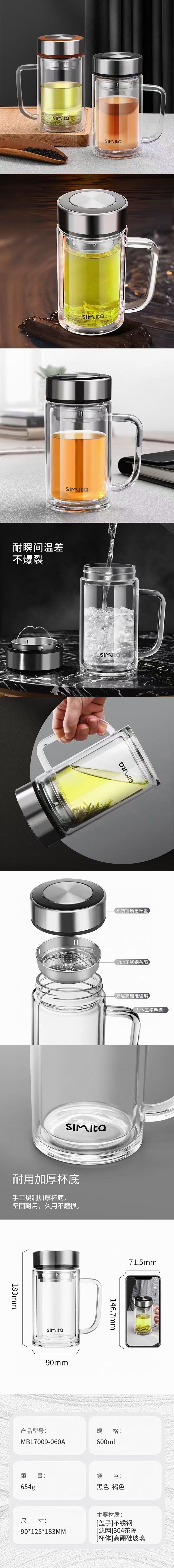 施密特 男士双层办公水杯 MBL7009-060A 黑色 600mL 1个