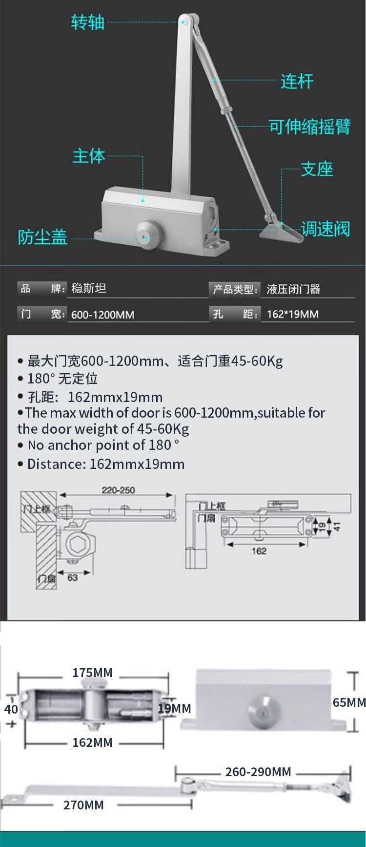 稳斯坦 自动闭门器 WJL150 液压缓冲自动关门器 承重45-60KG 1个