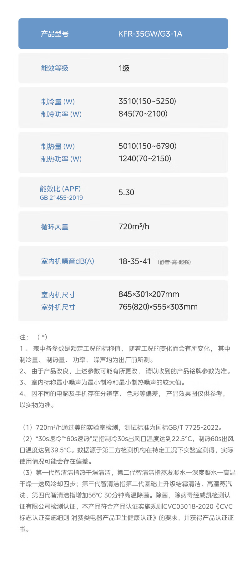 美的 空调 KFR-35GW/G3-1A 挂式 1.5匹 一级能效 1台