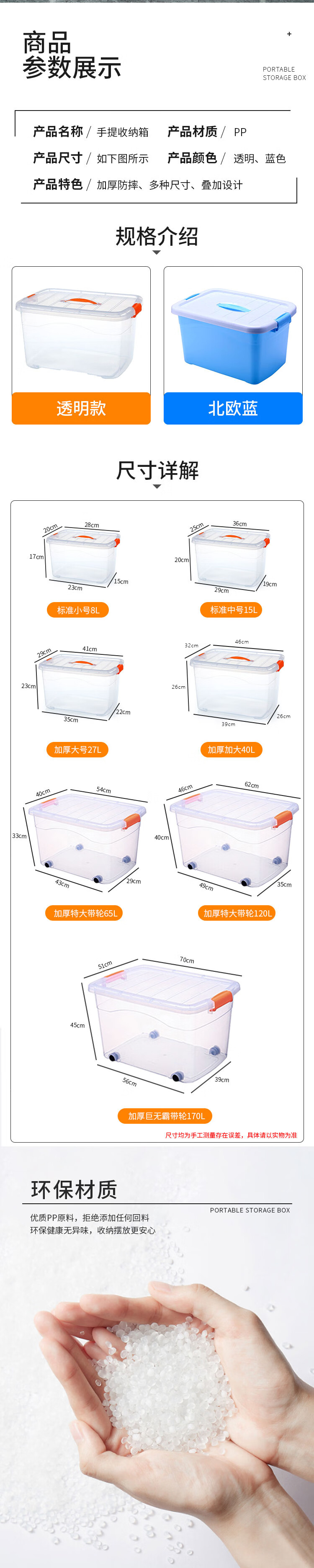金固牢 塑料带提手收纳箱 KCzy-254 透明超大号带轮120L 62*46*40cm 1个