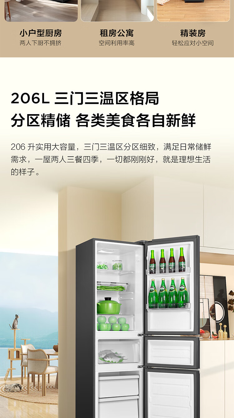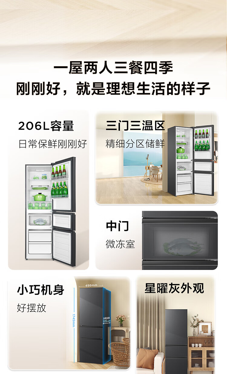 TCL 三开门冰箱 R206L1-C 灰色 2级能效 206L 1台