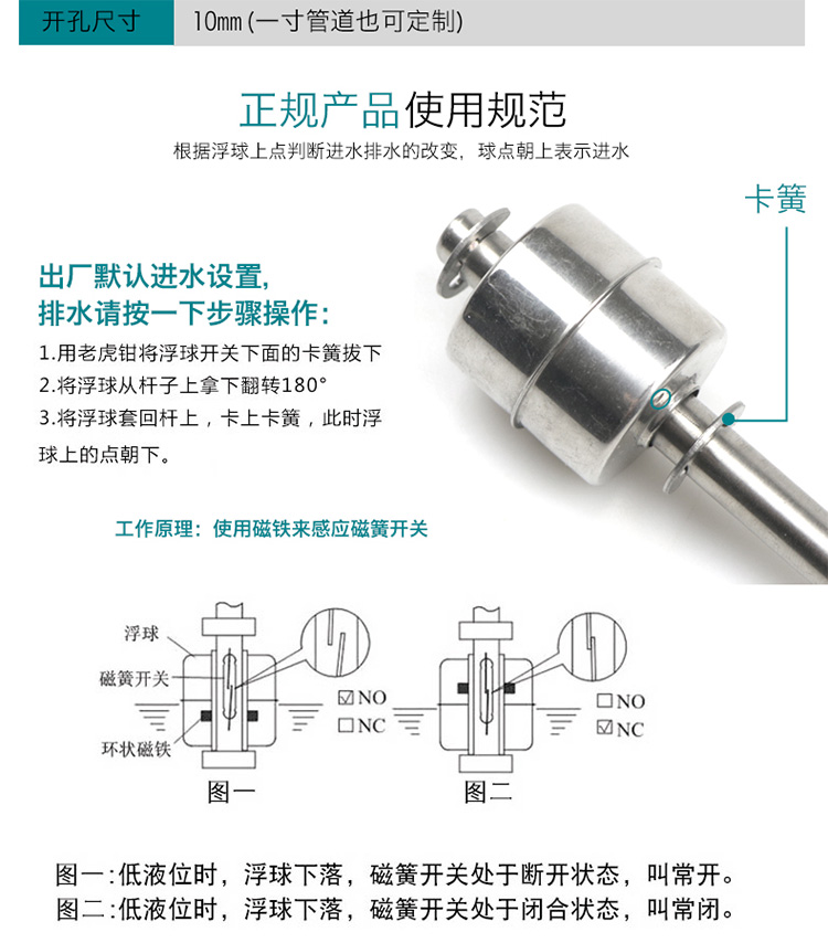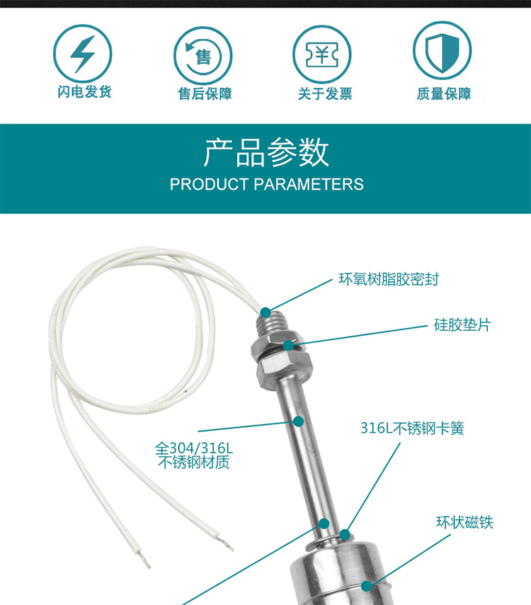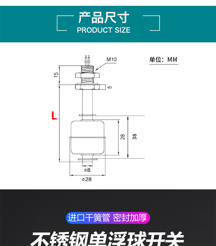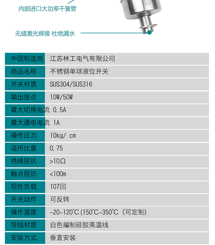 健林工控 304不锈钢单浮球开关 高温L=600mm(0-220V) 1根