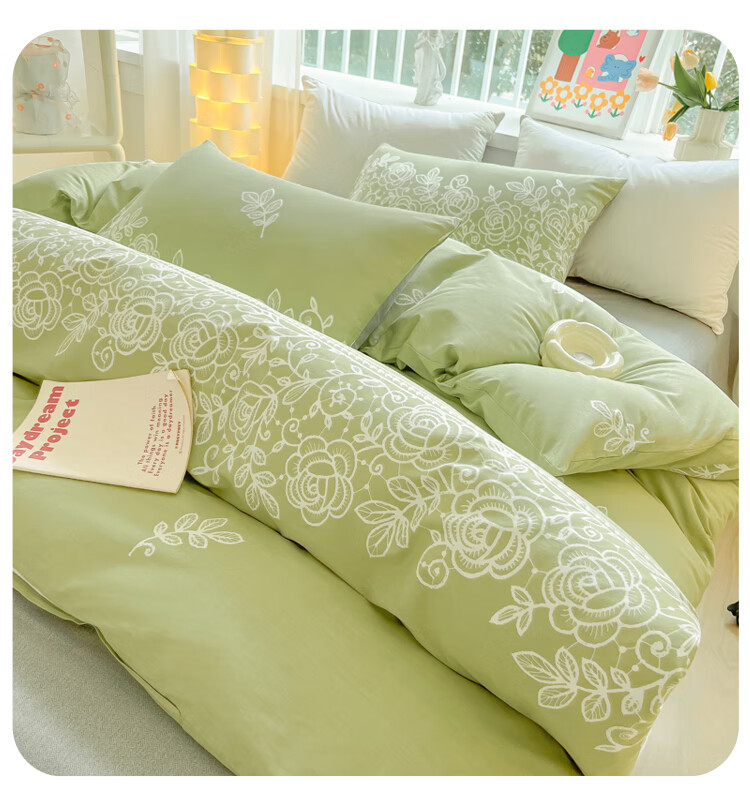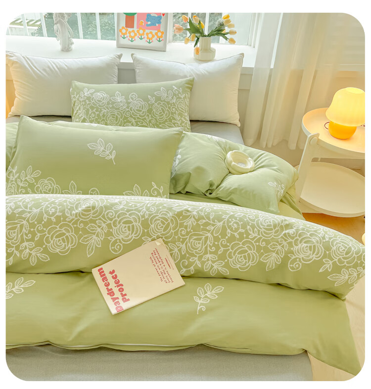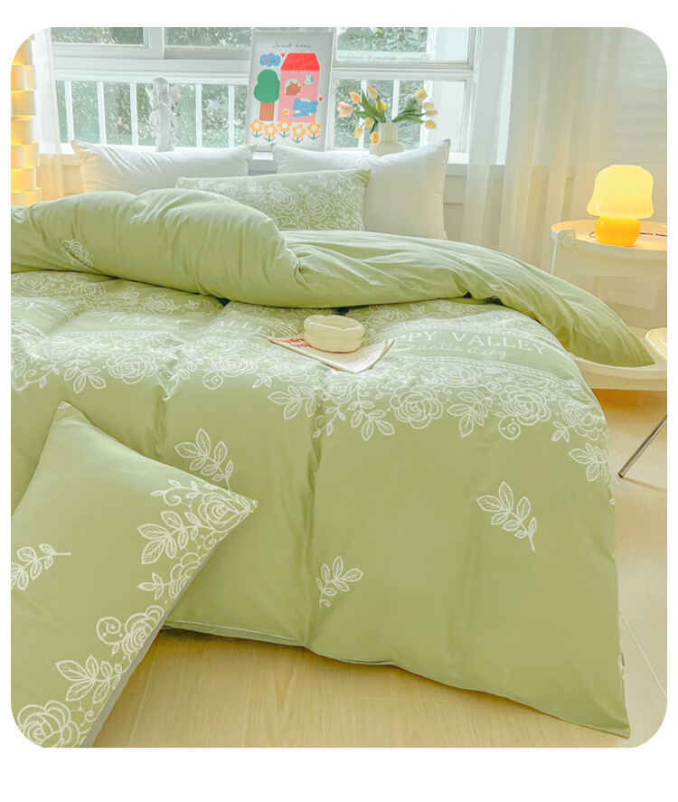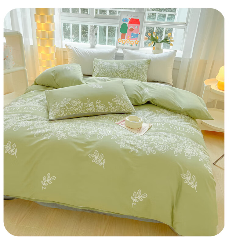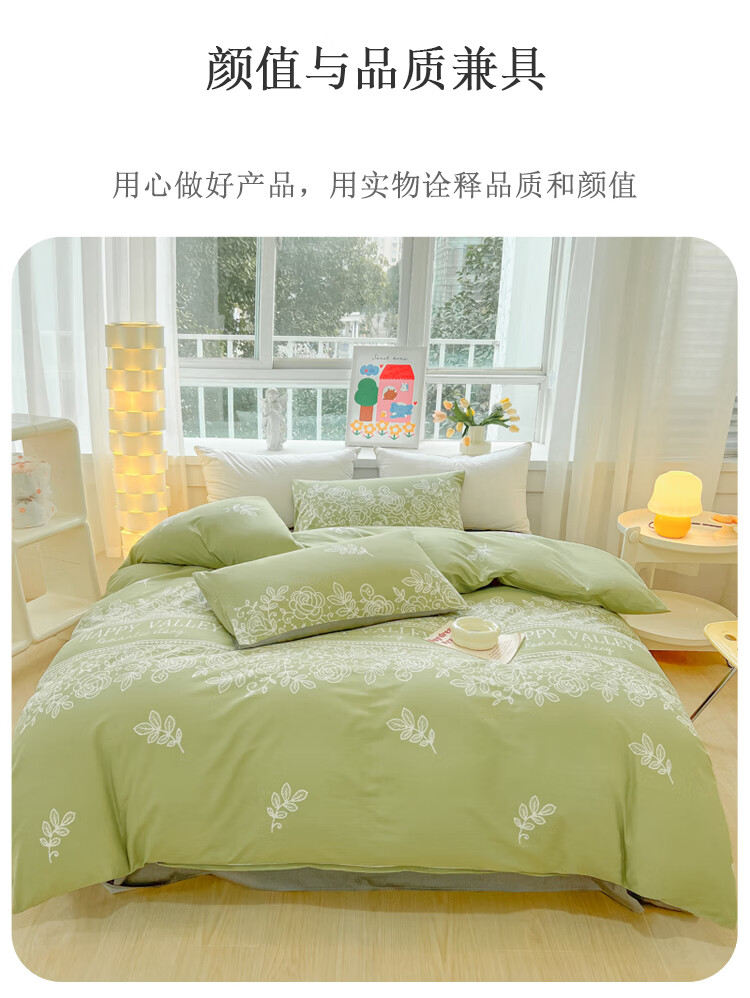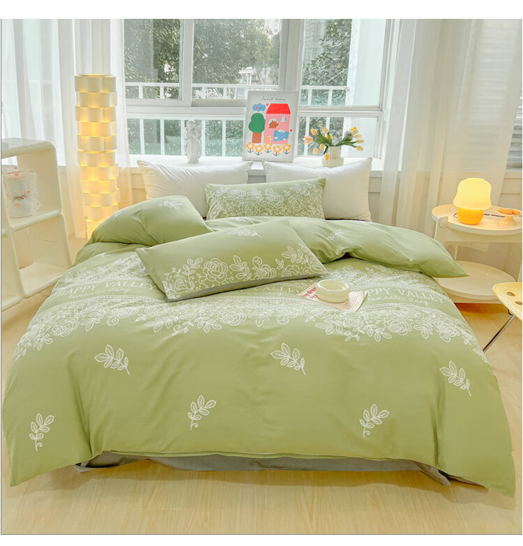 逸轩 全棉小清新四季款四件套 绿色心情 被套200×230cm+床单230×250cm+枕套48×74cm×2 1套