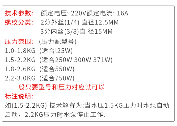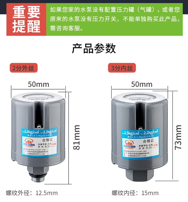 创新者 圆柱压力开关 3分内丝2.0-3.0kg 1个