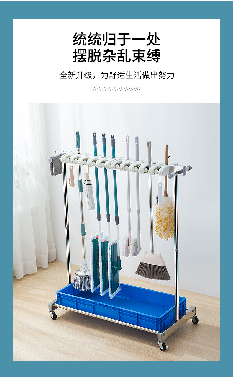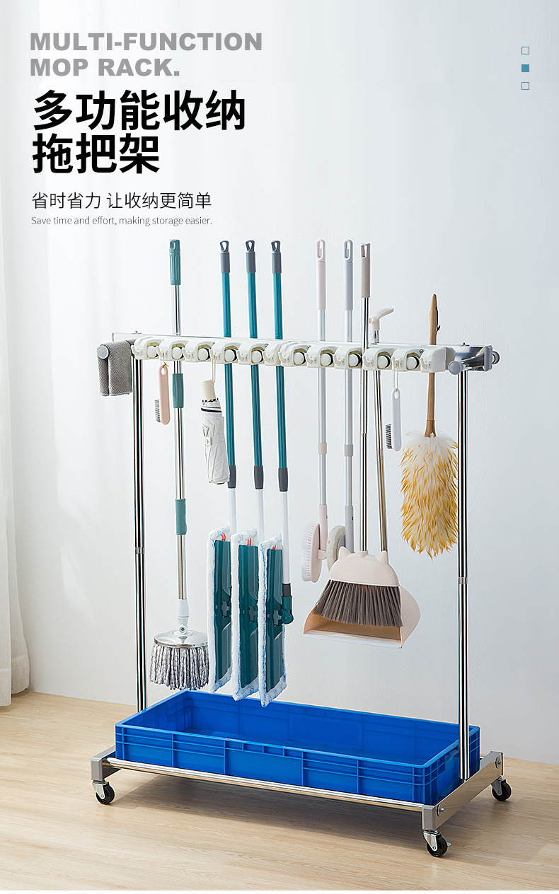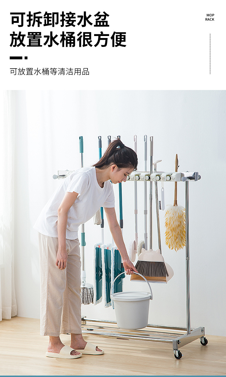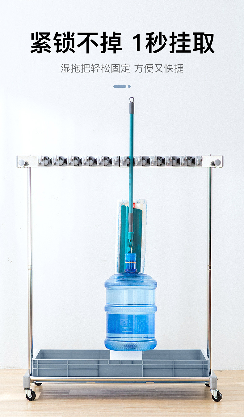 莱洁 不锈钢落地式移动拖把架 灰色豪华款-双排20拖48钩带扶手 1个