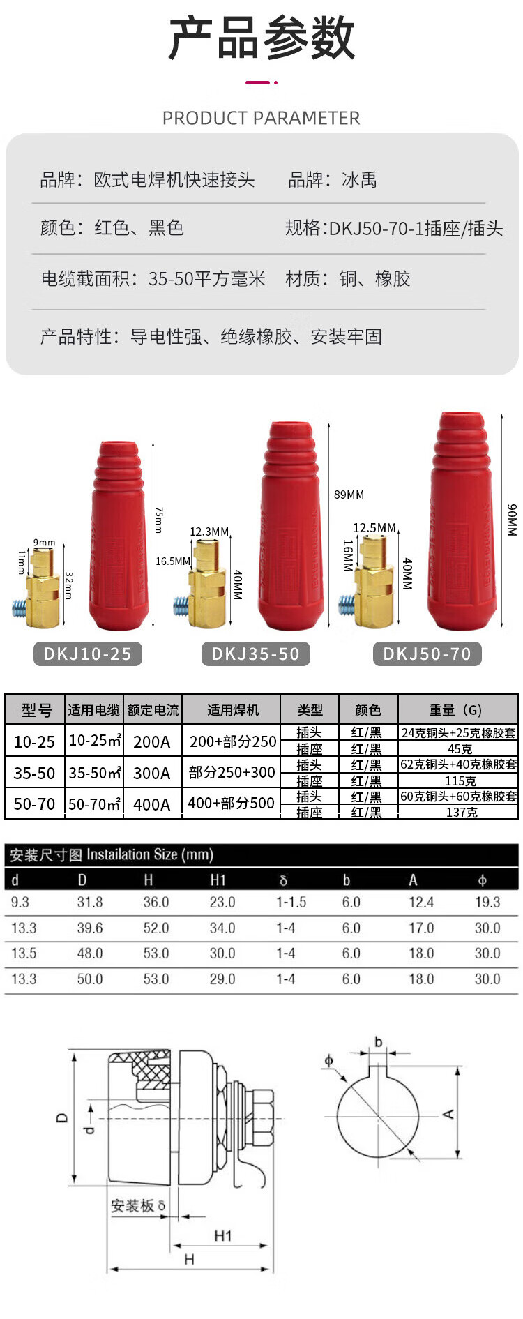 冰禹 欧式电焊机快速接头 DKJ50-70-1插头+插座 【黑红各1套】 1件