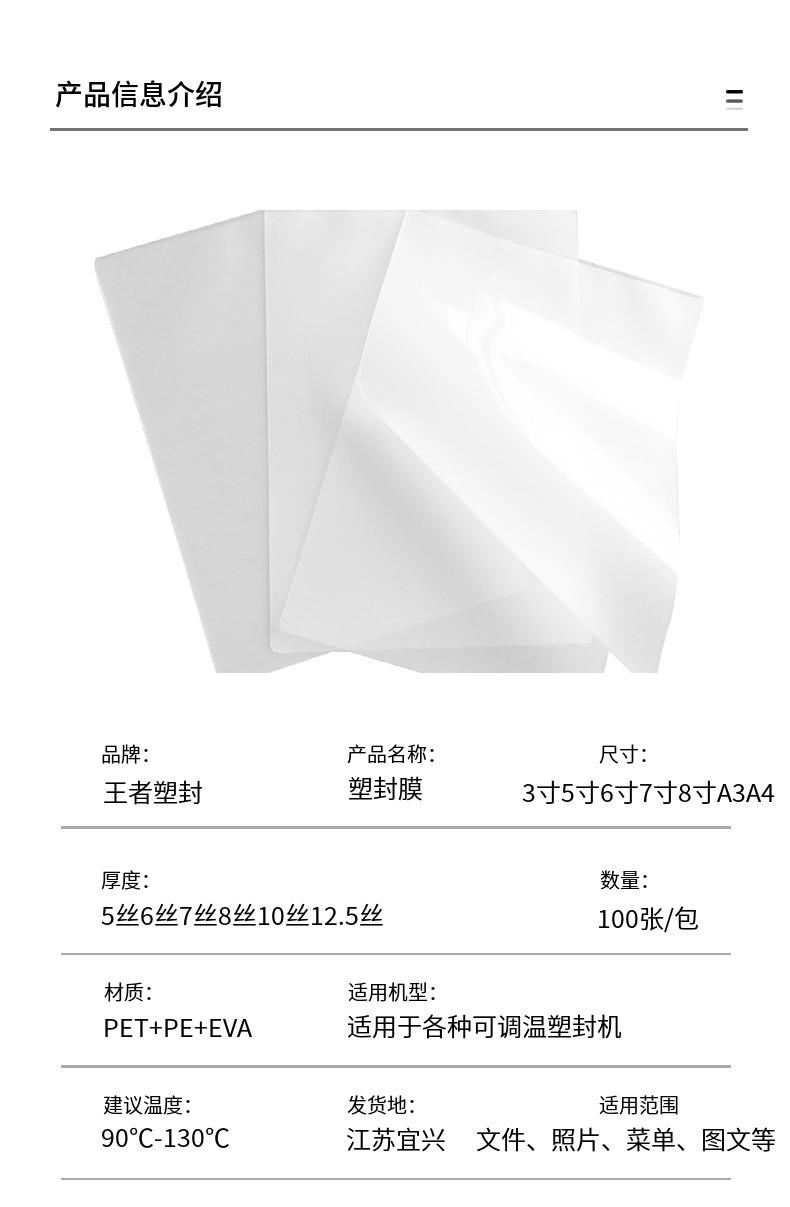 王者塑封 过塑膜 A4 7丝 100张 1包