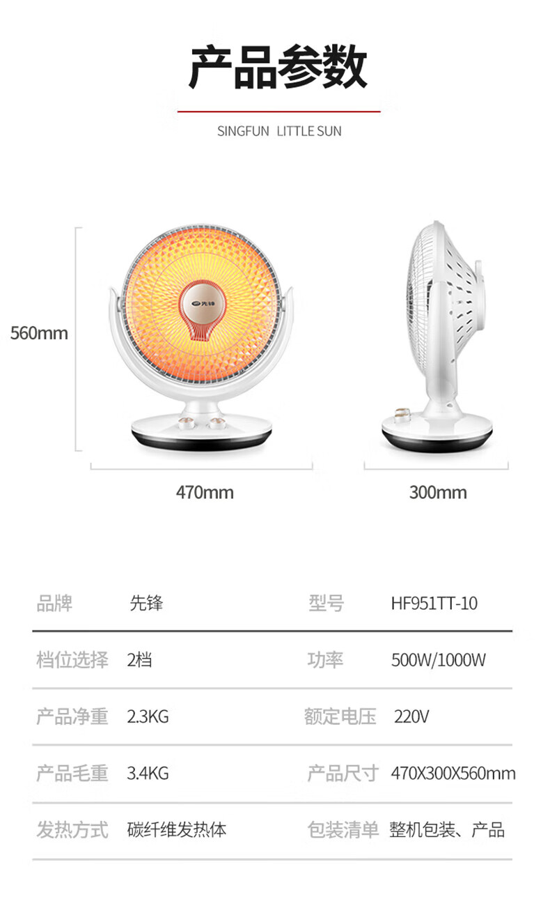先锋 小太阳取暖器 HF951TT-10 自动摇头 500W/1000W 1台