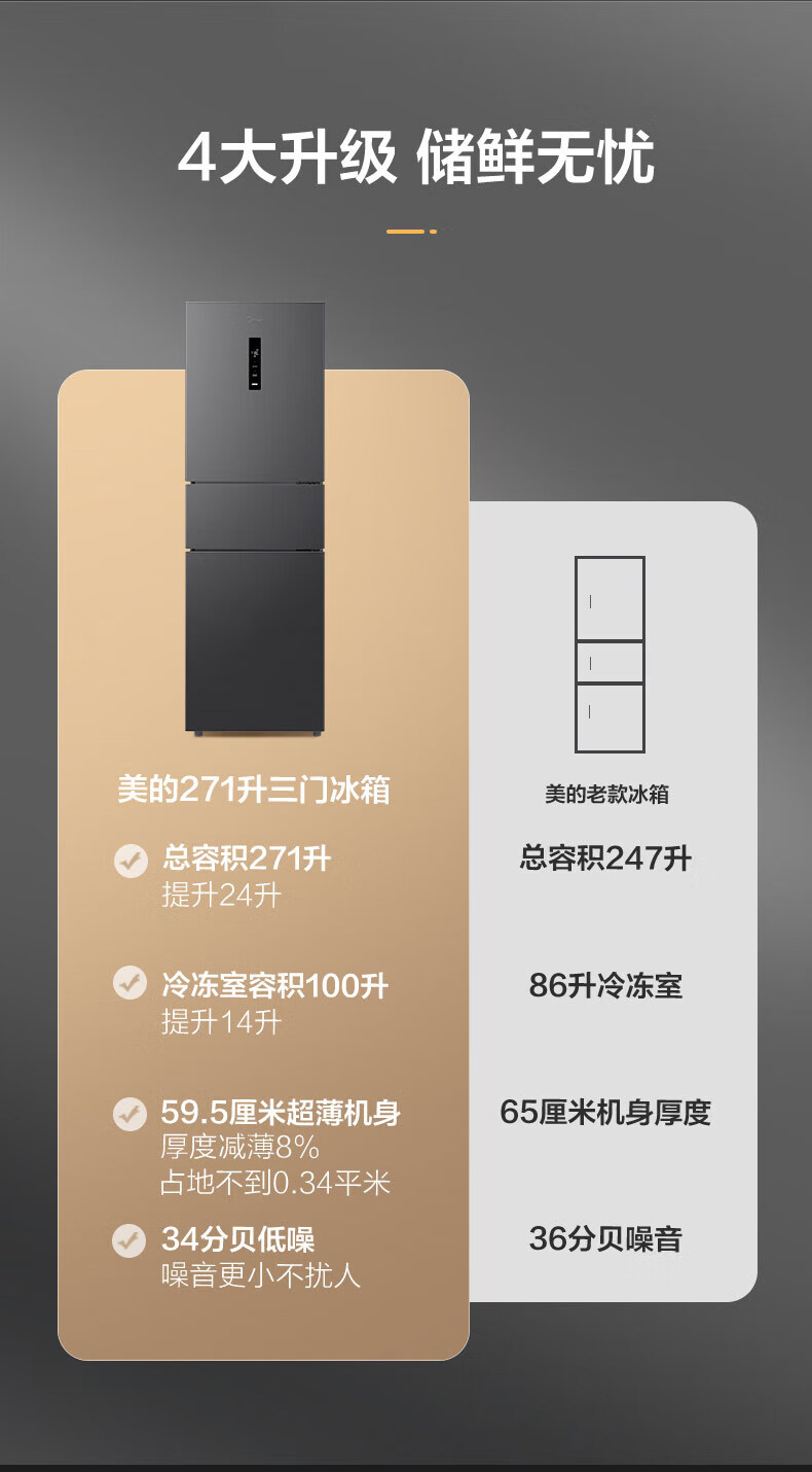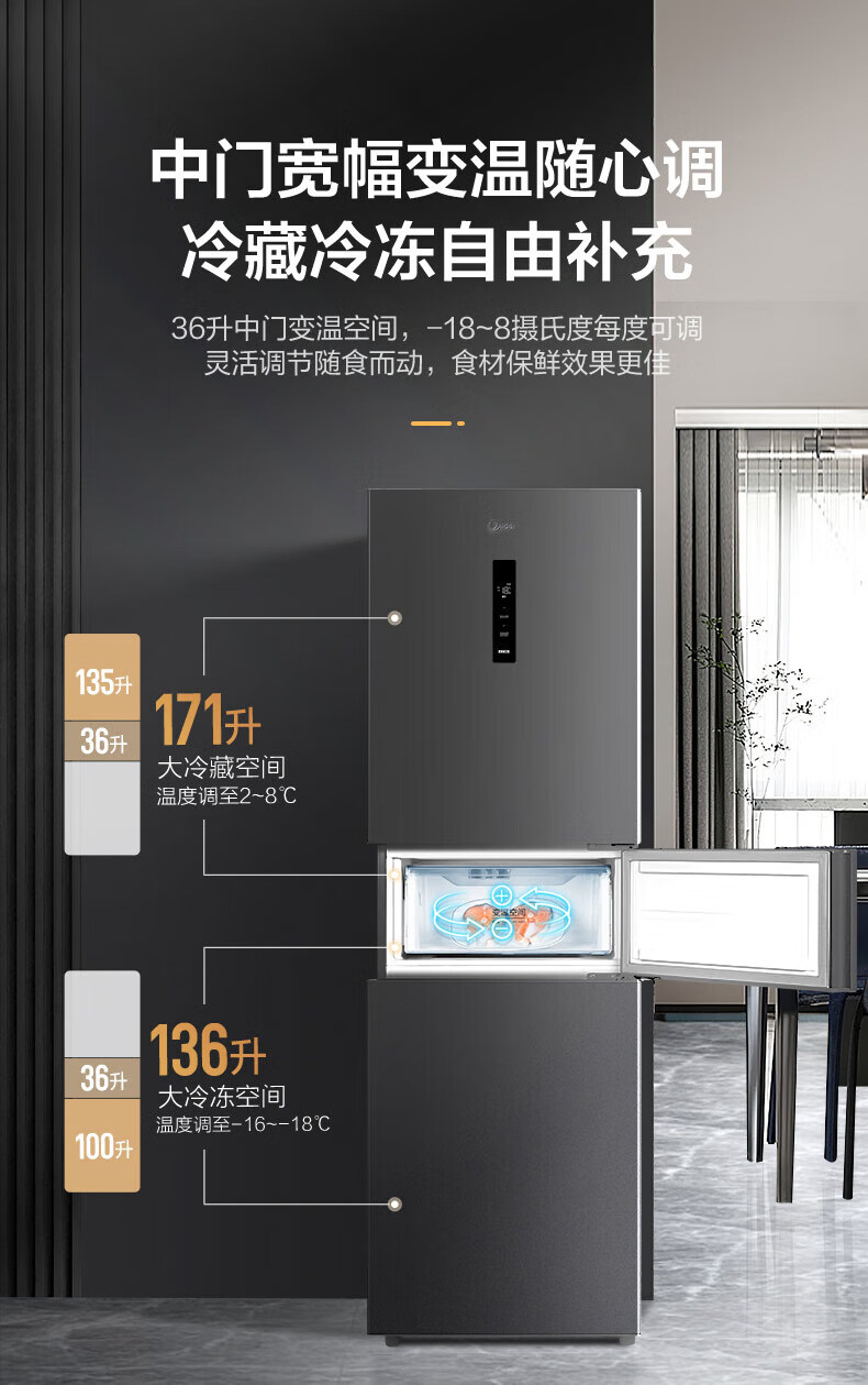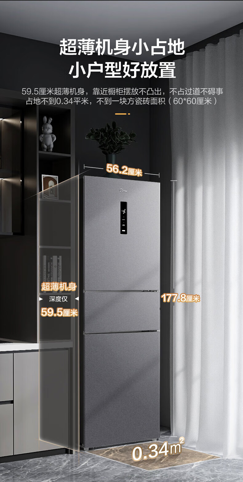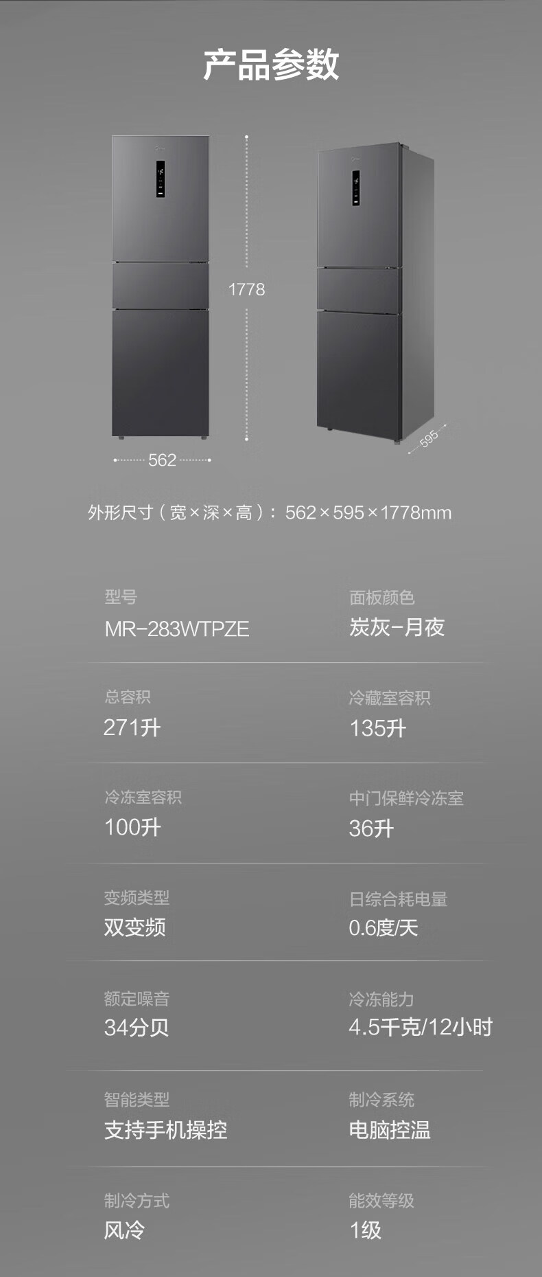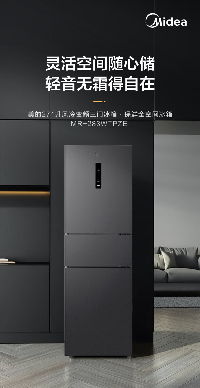 美的 三开门电冰箱 MR-283WTPZE 灰色 一级能效 271L 1台