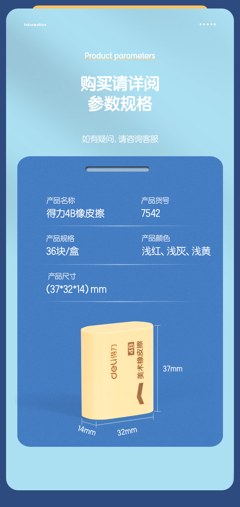 得力 4B橡皮擦 7542 颜色随机 37×32×14mm 1块
