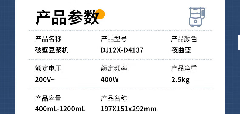 九阳 破壁机 DJ12X-D4137 1.2L 400W 夜宴蓝 1台