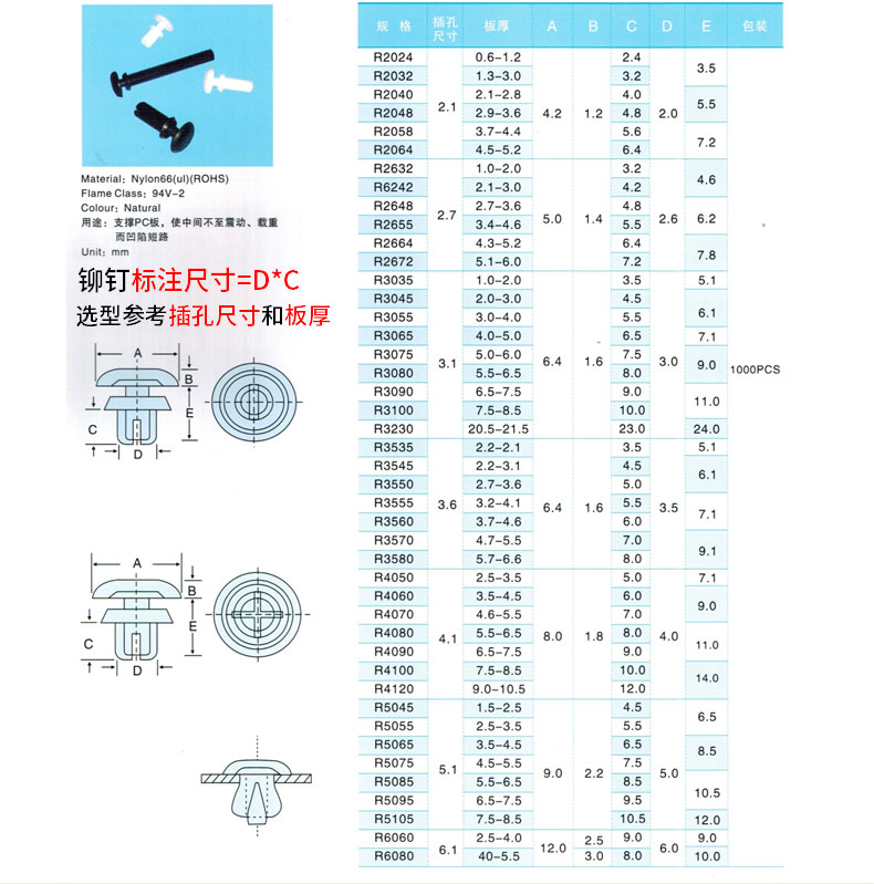 国产通用 尼龙塑料铆钉 黑色 R3535 100枚 1包