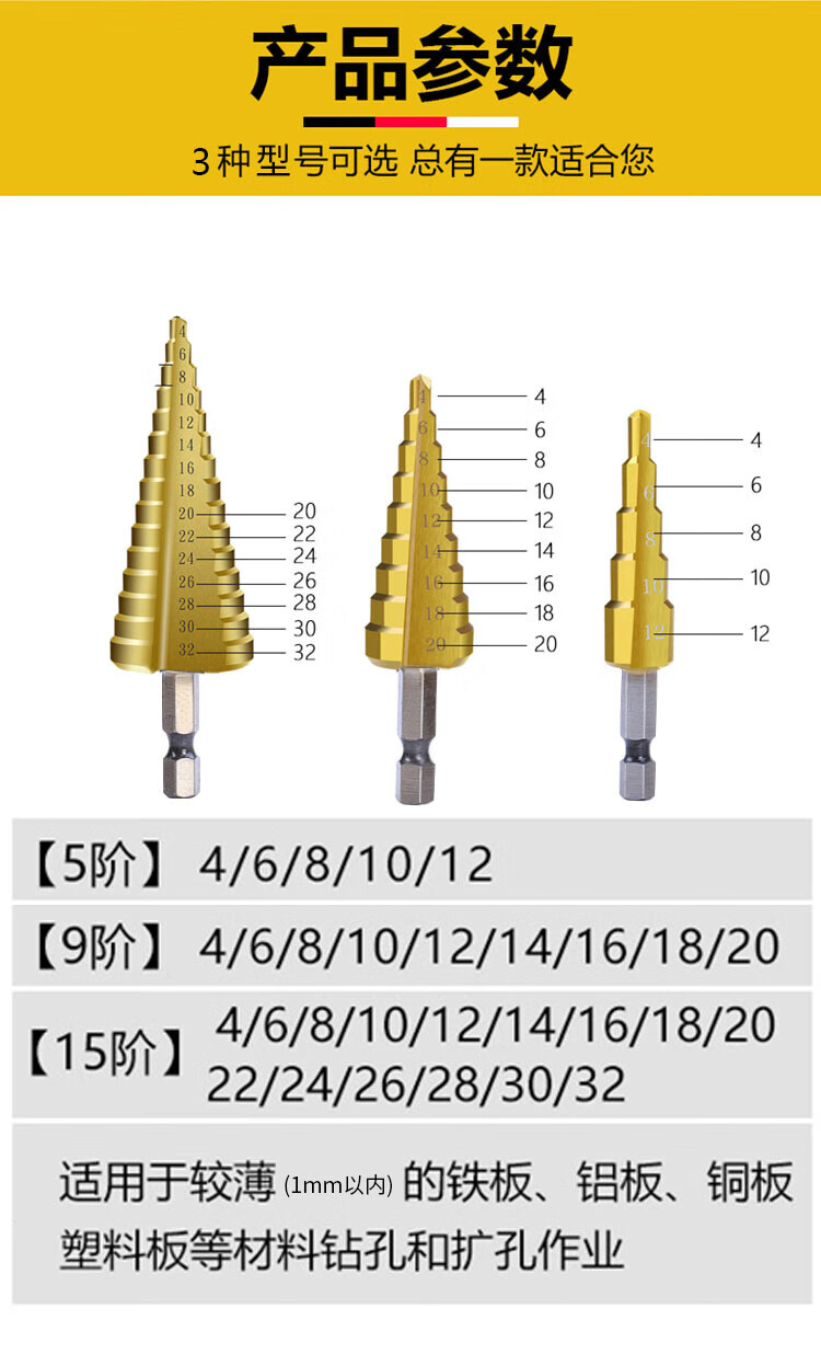 • 商品名称:海斯迪克 直槽六角柄阶梯钻