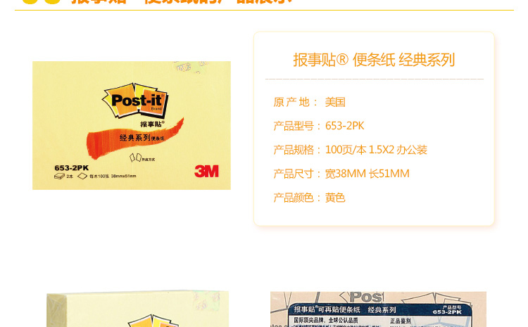 3M 抽取式报事贴 黄色 38*51mm 100页 2本 1件